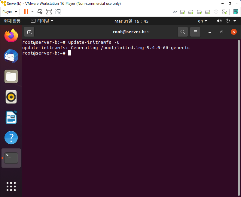 마지막으로 update-initramfs -u를 입력하여 설정 내용을 적용시키고 Server(b)를 재부팅한다.