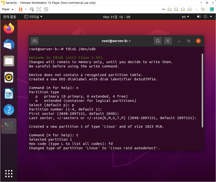 새로 생성된 하드디스크의 이름을 확인했으면 fdisk 명령어를 통해 각 하드디스크에 대한 파티션을 설정해준다.