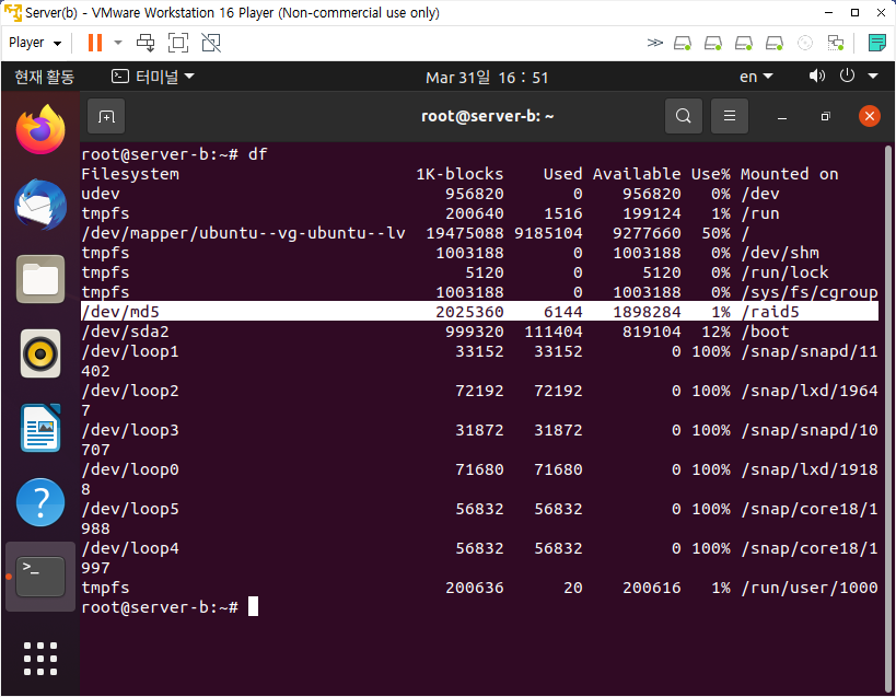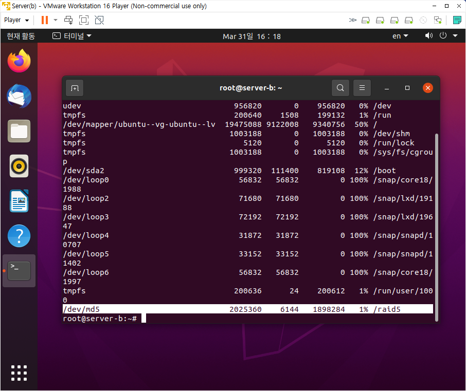 재부팅 후 터미널에 df 명령어를 입력하면 md5가 raid5에 잘 마운트되어 있음을 확인할 수 있다.