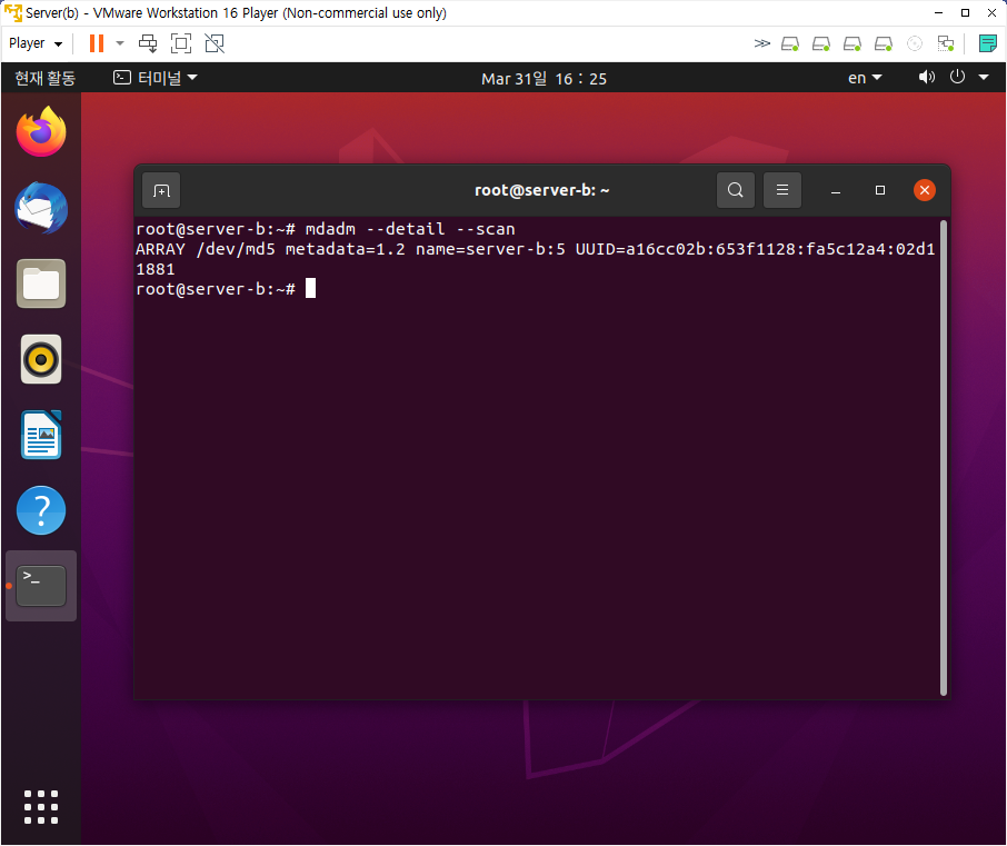 mdadm 버그를 방지하기 위해 터미널에 mdadm --detail --scan을 입력한 후 ARRAY 내용을 복사한다.