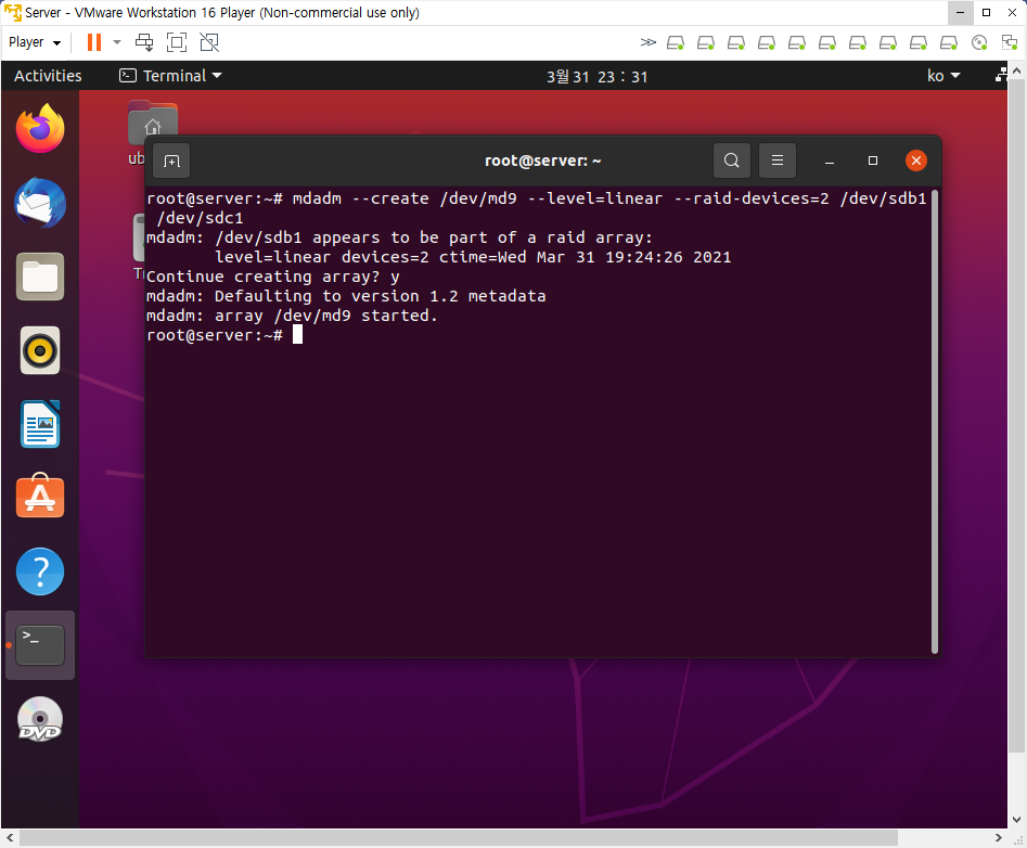 하지만 Linear RAID 방식인 md9과 RAID0방식인 md0는 구동 자체가 되지 않음을 확인할 수 있다.