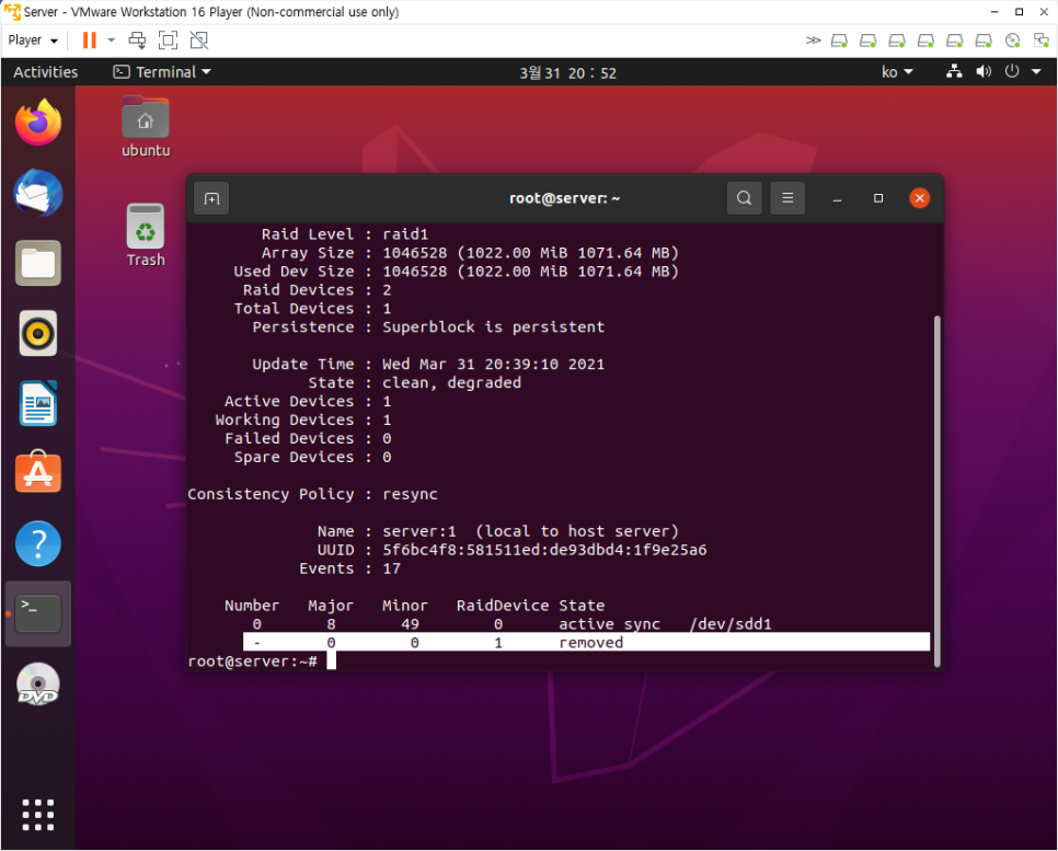 raid1을 동작시킨 후 확인해보니 하드디스크 하나가 제거된 상태임을 알 수 있다.