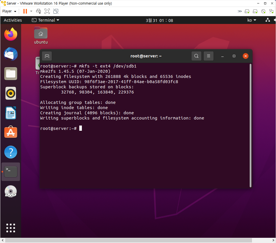 하드디스크의 파티션은 Primary, Extended, Logical의 3가지 종류가 있는데, 여기서는 Primary 파티션으로 설정하였다. w를 눌러 저장해준 뒤 mkfs -t ext4 /dev/sdb1을 입력하여 sdb1 파일시스템을 포맷해주었다. 여기서 ext4란 파일시스템의 종류를 의미하고 sdb1은 방금 생성한 파티션이다.