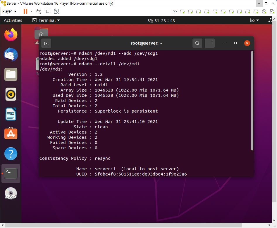 앞서 md1과 md5에서도 하드디스크 한 개가 연결되지 않은 상태이므로, 두 개의 RAID에 대해서도 하드디스크를 추가해주어야 한다. 이때 add 명령어를 사용하며, 작업한 결과는 다음과 같다.