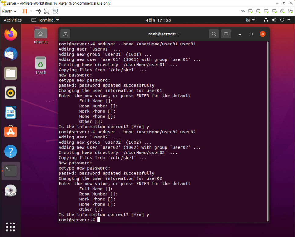 다음으로 adduser 명령어로 userHome을 홈 디렉터리로 갖는 사용자 user01과 user02를 추가한다.