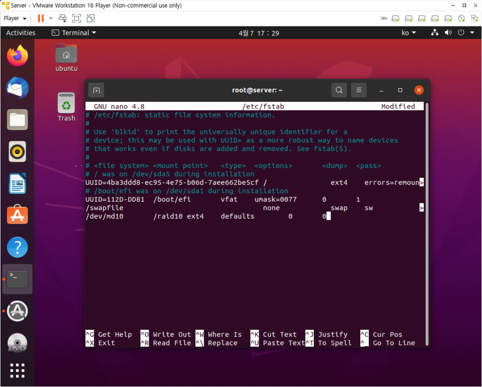 이어서 RAID1+0이 부팅 시에 자동으로 마운트될 수 있도록 /etc/fstab에 RAID1+0의 내용을 추가해준다.