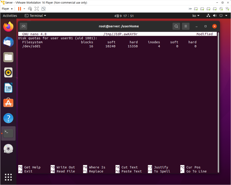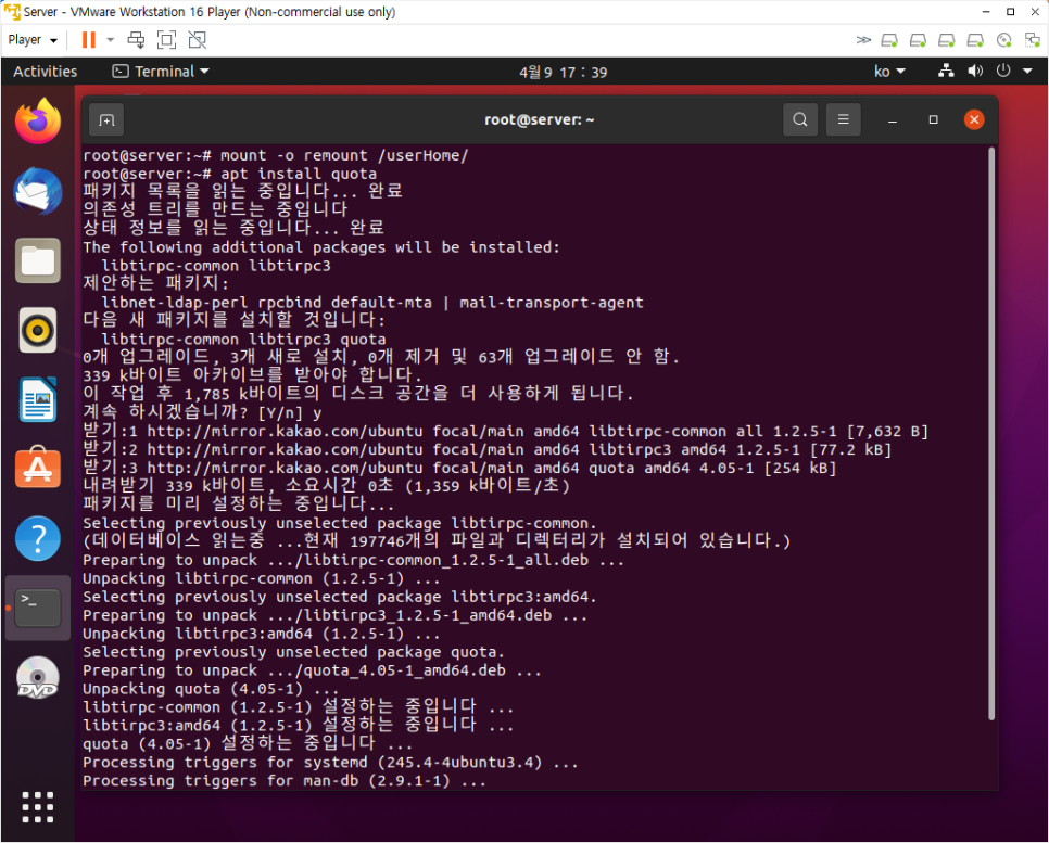이어서 remount 명령어로 userHome에 sdd1을 다시 마운트하고 quota를 설치한다.