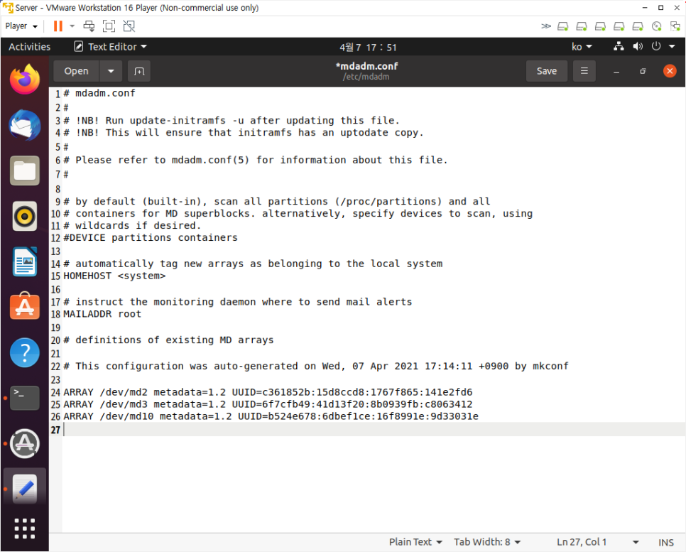 그리고 mdadm의 버그를 예방하기 위해 /etc/mdadm/mdadm.conf에 3개의 RAID의 ARRAY 내용을 추가한 후 'name=server:숫자'를 삭제한다.