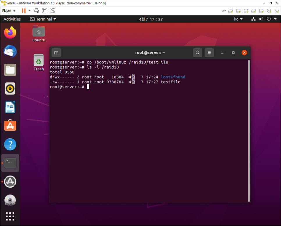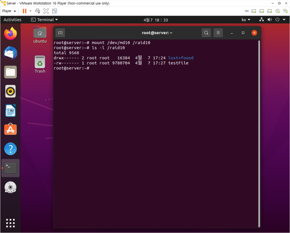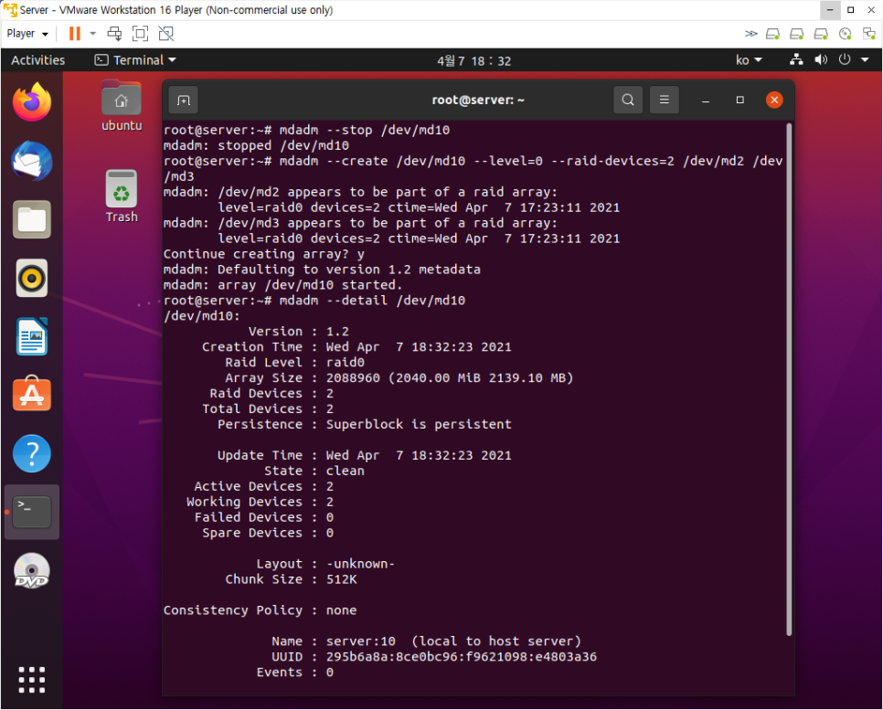 우선 VMware에서 리눅스 Server에 하드디스크 4개를 추가한 후, 터미널에서 mdadm을 설치하고 각각의 디스크에 대한 파티션을 생성한다. 그리고 mdadm명령어를 이용하여 RAID1+0을 생성한다. sdb1과 sdc1, sdd1과 sde1로 각각 RAID1을 구성하고 생성된 2개의 RAID로 RAID0을 구성하면 된다.