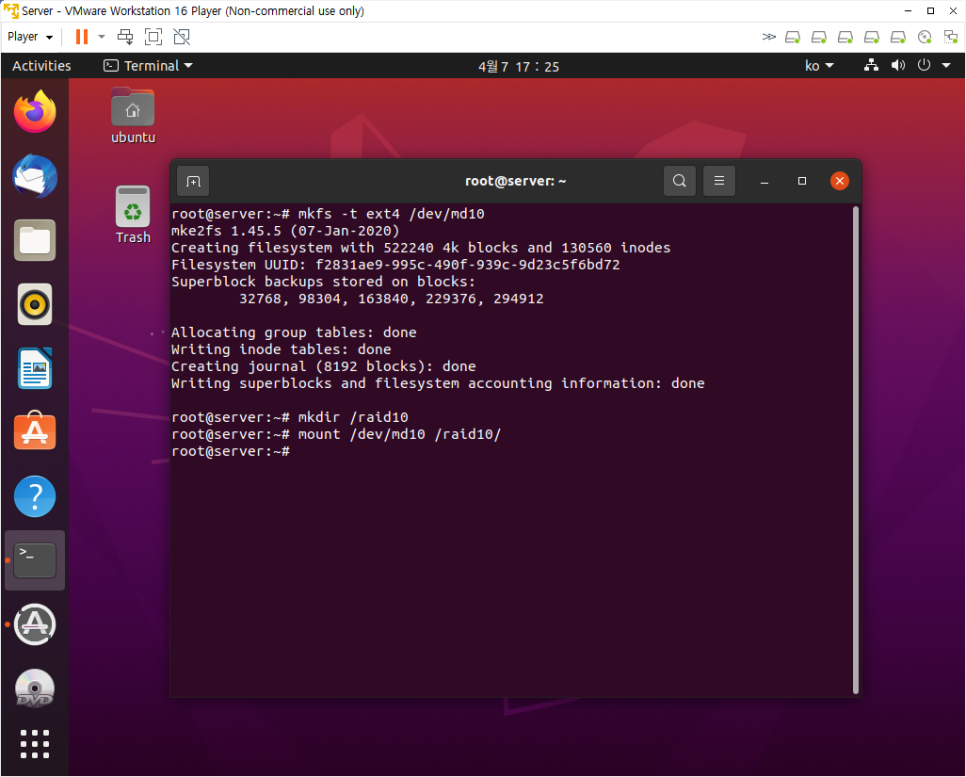 생성된 RAID1+0에 대한 파일시스템을 만들고 이를 마운트할 디렉토리를 생성하여 마운트한다.