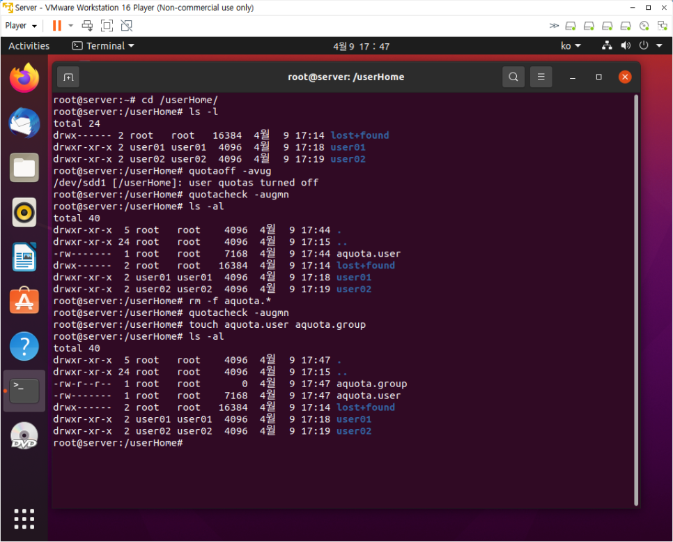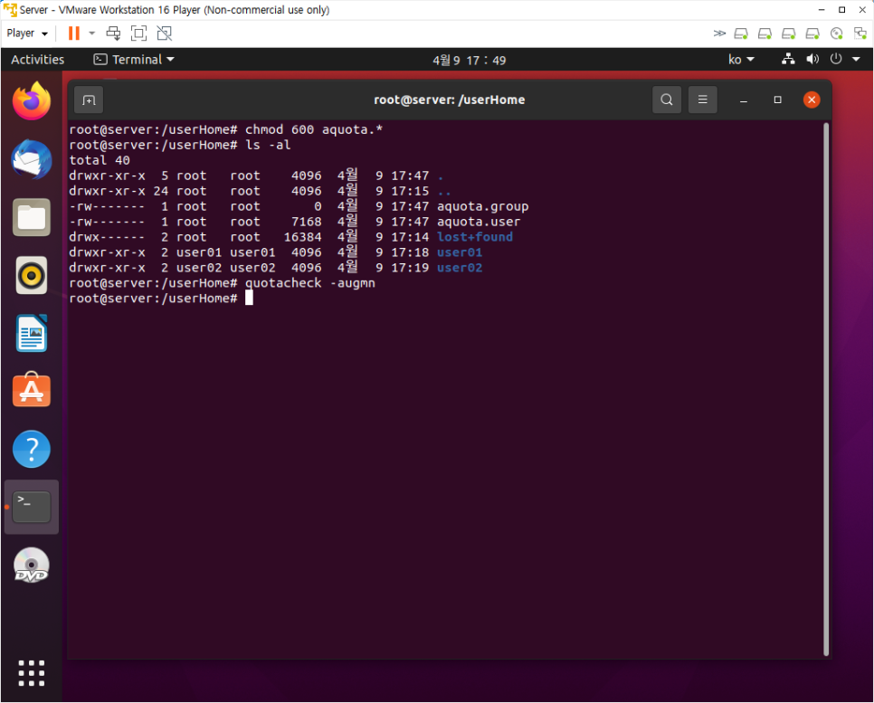 이어서 쿼터 관련 파일을 root 계정 외에는 접근하지 못하도록 설정한다.