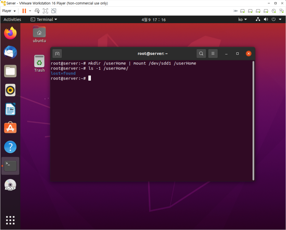 우선, 새로운 하드디스크를 Server에 추가하고 파티션을 생성한 후 userHome이라는 디렉토리를 생성하여 마운트한다.