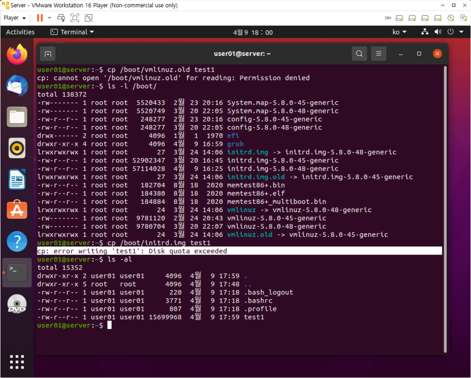 이제 새로 생성한 사용자 계정으로 들어가 적당한 크기의 파일을 저장해본다. 처음에 /boot/vmlinuz.old 파일을 복사하여 저장하려고 했는데 저장이 되지 않아 파일의 권한을 확인해보니 root계정만 접근이 가능하도록 설정되어 있었다. 그래서 다른 파일을 찾아보았고 /boot/initrd.img 파일을 복사하여 user01 계정으로 저장해보았다. 그랬더니 용량을 초과한다는 문구가 나왔고 확인해보니 /boot/initrd.img 파일의 일부만 저장된 것을 확인할 수 있었다.