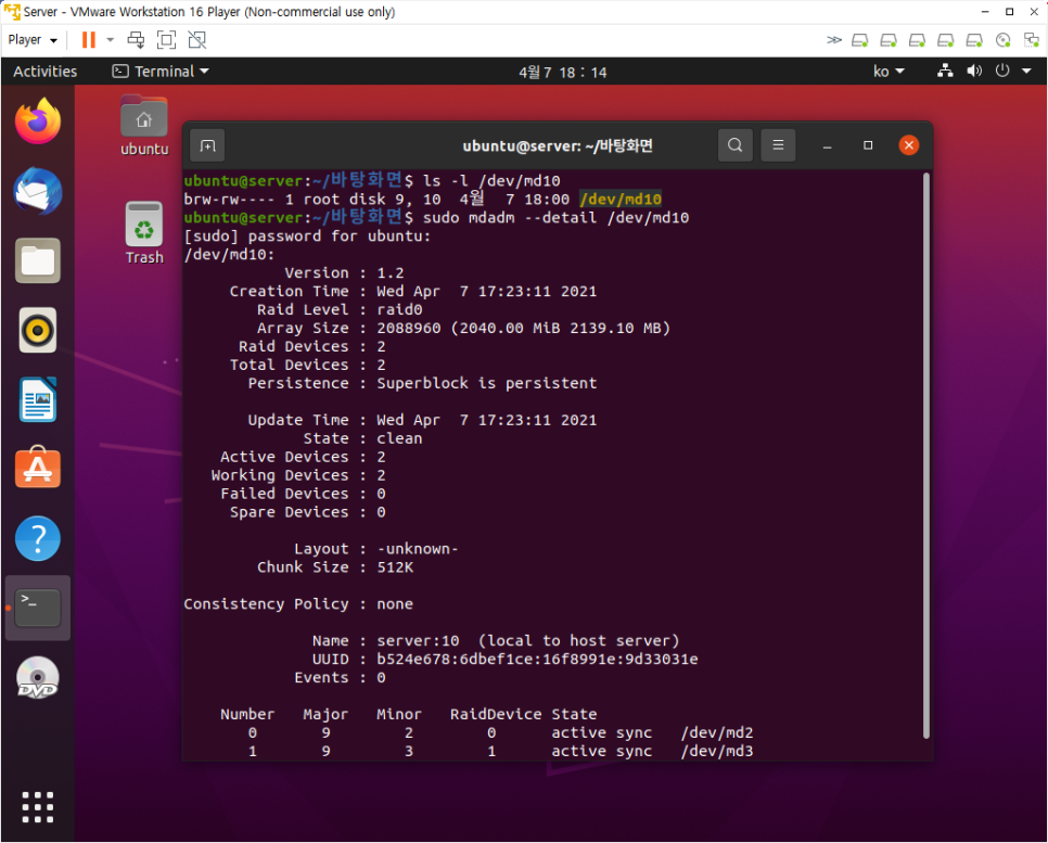다시 /etc/fstab의 주석을 제거하고 재부팅을 해주는데, 재부팅 후에도 RAID1+0이 작동하지 않는다면 이는 mdadm의 버그일 가능성이 있다. ls /dev/md*을 입력하여 RAID를 확인해보니, md127과 같은 알 수 없는 RAID가 생성되어 있었다. 따라서 md127을 멈추고 md10으로 RAID0을 다시 구성하였더니 RAID1+0이 정상적으로 작동하는 것을 확인할 수 있었다.
