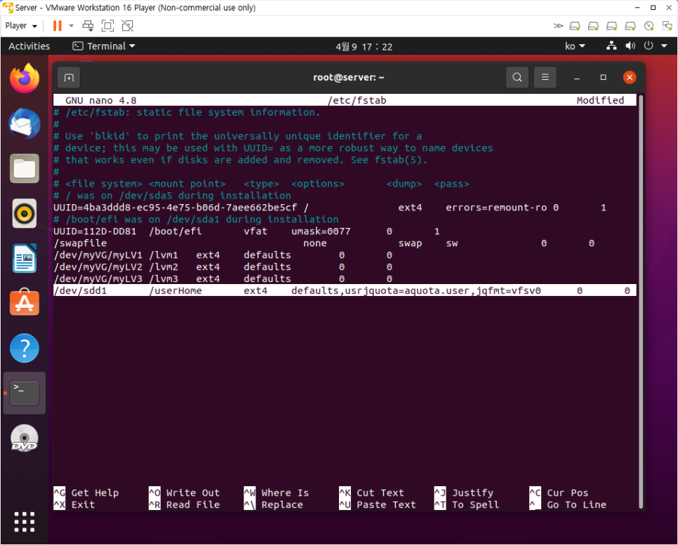 다음으로 /etc/fstab에 마운트한 파티션에 대한 내용을 추가하는데, 이 때 아래와 같이 옵션으로 usrjquota=aquota.user,jqfmt=vfsv0 을 추가해준다.