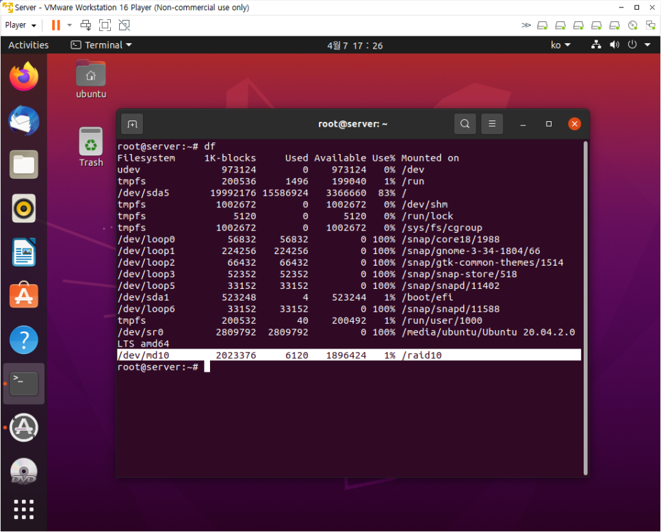 최종적으로 update-initramfs -u 명령을 입력하고 재부팅하면 아래와 같이 RAID1+0이 정상적으로 작동하는 것을 확인할 수 있다.