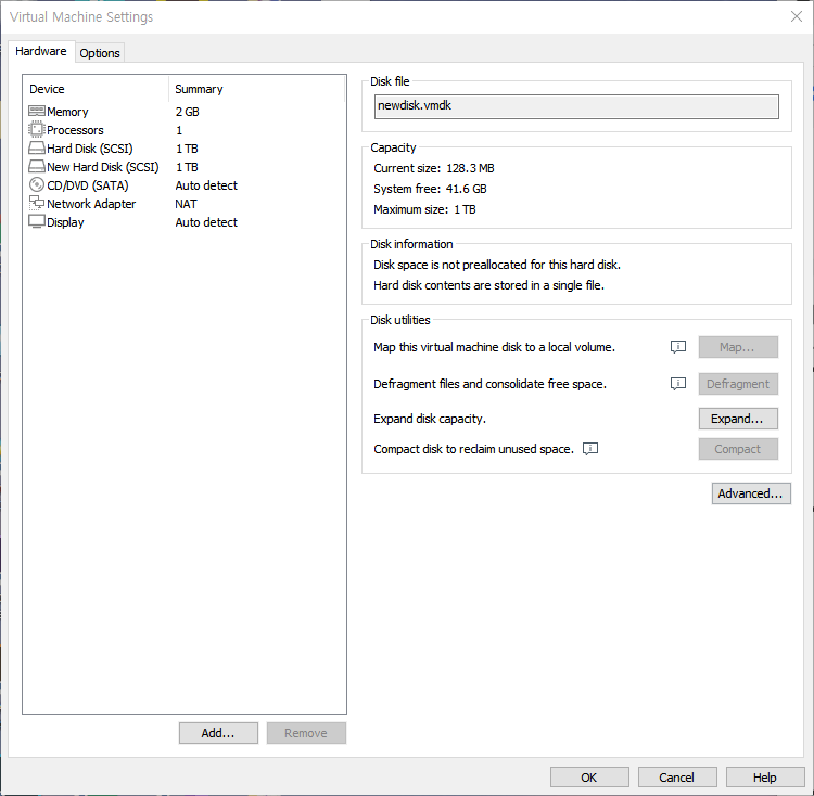 3. Customize Hardware에서 아래와 같이 설정을 변경해주었다. 사용자 필요에 따라 설정은 마음대로 변경해주면 된다. 또한 기존에 설정되어 있던 하드디스크 용량을 1TB로 늘려주고 1TB짜리 하드디스크를 하나 더 추가해주었다.