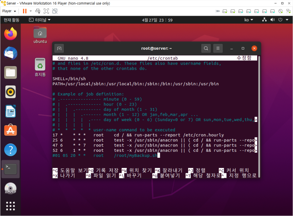 2. nano 에디터로 /etc/crontab 에 들어가 맨 아랫줄에 아래 내용을 입력한다.