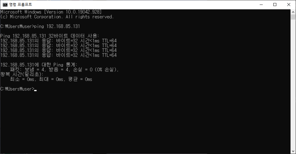 아래 사진은, 윈도우의 명령 프롬프트에서 리눅스 Server(b)로 신호를 보내어 데이터 송신이 잘 되는지 확인해본 것이다.