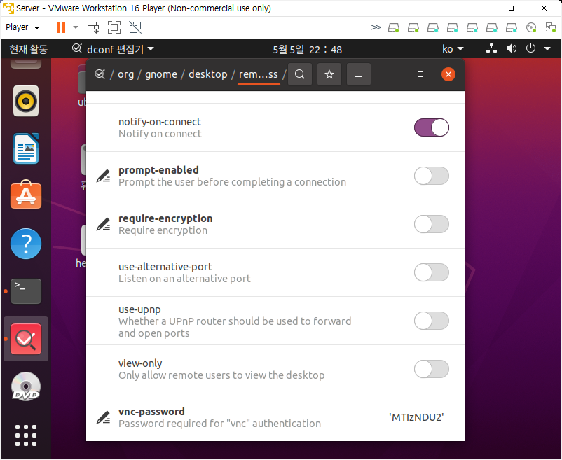 dconf-editor를 실행한 후 require-encryption의 설정을 해제해주고 ufw allow 5900/tcp 명령어로 방화벽 설정을 변경해준다.