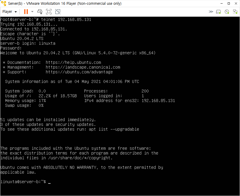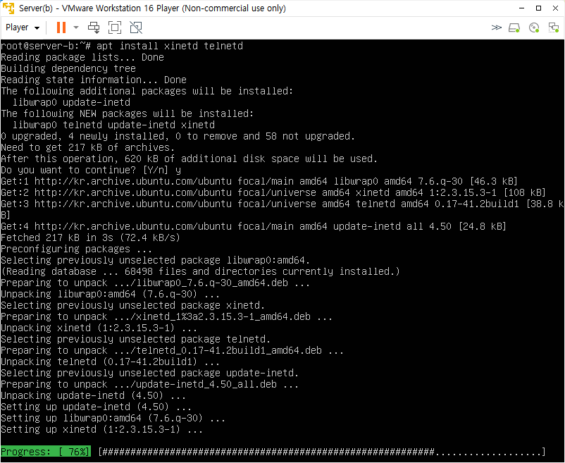Telnet server를 구축하기 위해서는 우선 Server(b)에서 xinetd와 telnetd를 설치해주어야 한다.