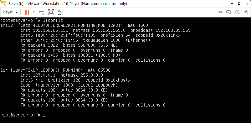 그럼 다음과 같이 ens32 옆에 'inet'이라고 쓰여 있는 부분에 현재 IP주소가 나타나는 것을 확인할 수 있다.