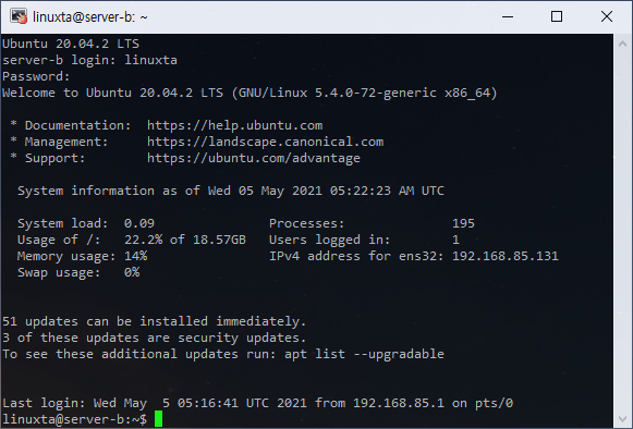 다음으로는 OpenSSH 서버를 통한 원격 접속 실습을 해보았다. SSH sever의 경우 데이터 전송 시 패킷을 암호화하여 IP Spoofing을 방지할 수 있다는 장점이 있다. 우선 Server(b)에 openssh-server를 설치한 후 systemctl 명령어로 ssh를 가동시킨다. 그 후 방화벽에서 22번 포트를 허용해주면 openssh 서버를 사용할 준비가 된 것이다. 아래 사진은 iPuTTY로 SSH server를 통한 원격 접속을 시도한 모습이다.