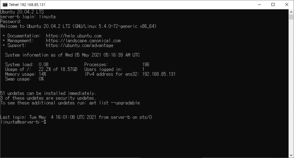 ufw allow 23/tcp 명령으로 방화벽에서 23번 포트를 허용해주고 telnet (IP주소)를 입력하면 아래와 같이 입력한 IP주소로 원격 접속할 수 있게 된다.