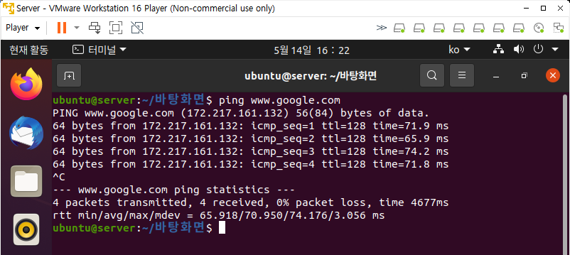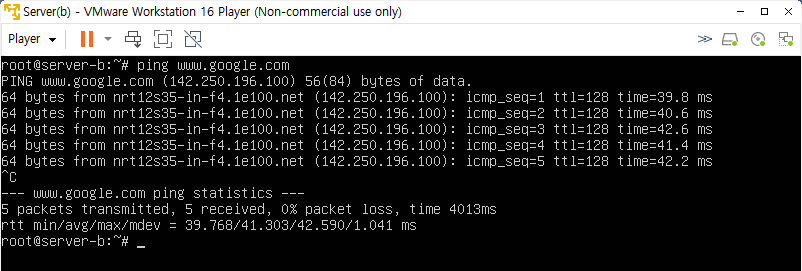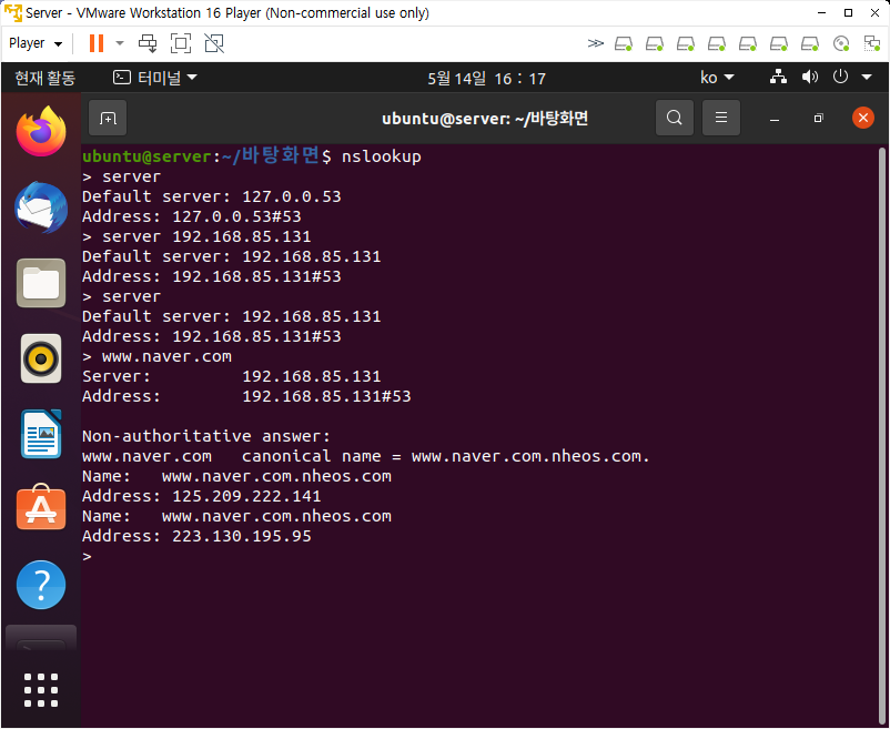 이를 우분투 Server(데스크톱 버전)에서도 사용할 수가 있는데, Server의 터미널에서 nslookup명령을 입력하고 server의 IP주소를 Server(b)로 변경한 후 도메인 이름을 검색하던지, 아니면 /etc/resolv.conf 파일에서 기존의 네임 서버 내용을 주석 처리하고 Server(b)의 IP주소를 저장한 후 도메인 이름을 입력하여도 된다. 아래 두 장의 사진 중 첫번째는 nslookup에서 바로 server의 IP주소를 변경하여 도메인 이름을 검색한 것이고, 두번째는 /etc/resolv.conf 파일에 Server(b)의 IP주소를 등록하고 구글의 도메인 주소로 신호를 보내본 것이다.