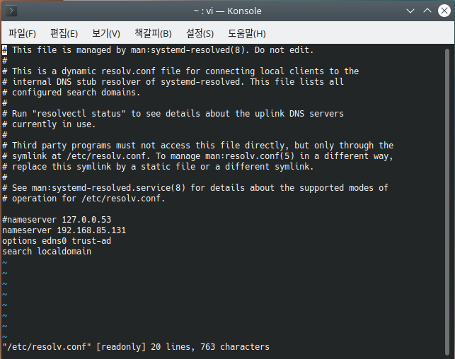다음으로 웹브라우저에서 네임서버가 제대로 작동하는지 확인하였다. 우선, vi에디터로 /etc/resolv.conf파일을 열어 기존의 네임서버를 주석 처리하고 nameserver (Server(b)의 IP주소)를 입력하여 저장한다.