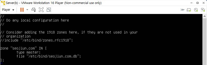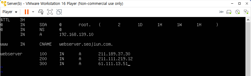 우선 Server(b)에 Round Robin DNS를 설정한다. vi에디터로 /etc/bind/named.conf.local 파일을 아래와 같이 편집한다.