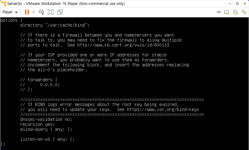 이를 사용하기 위해서는 우선 Server(b)에 apt명령어로 bind9와 bind9utils가 설치되어야 한다. 설치가 되었으면 vi에디터로 /etc/bind/named.conf.options에 들어가 dnssec-validation 옆의 글자를 no로 바꾸고 그 아래에 다음과 같이 2줄의 내용을 추가한다.