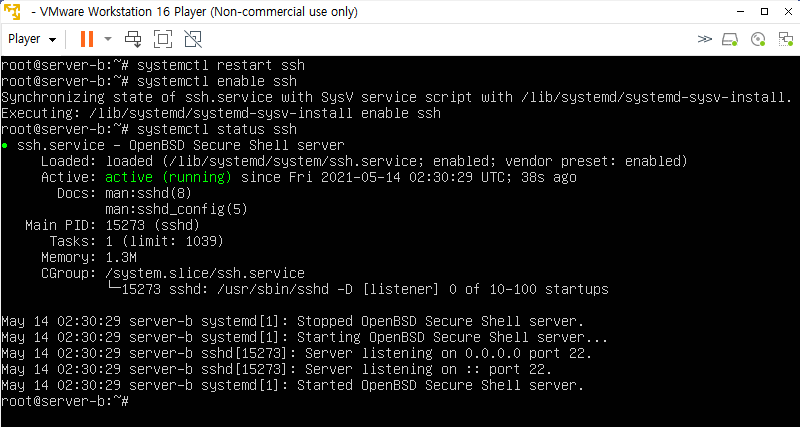 우선 Server(b)에 adduser명령으로 원격접속 사용자를 생성한다. 다음으로 apt 명령으로 openssh-server를 설치한 후 systemctl 명령으로 openssh가 동작될 수 있도록한다.