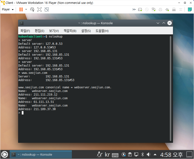 이후 systemctl restart named 명령을 입력하고 Client(Kubuntu)에 접속하여 nslookup 명령으로 새로 생성한 네임서버의 IP주소를 확인하였다. 이때, server의 IP주소를 Server(b)로 변경한 상태에서 확인해야 한다!