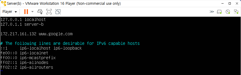 하지만 아래와 같이 vi에디터로 /etc/hosts 파일에 IP주소와 도메인 이름을 입력해놓으면 해당 도메인 이름으로는 계속 접속이 가능하다.