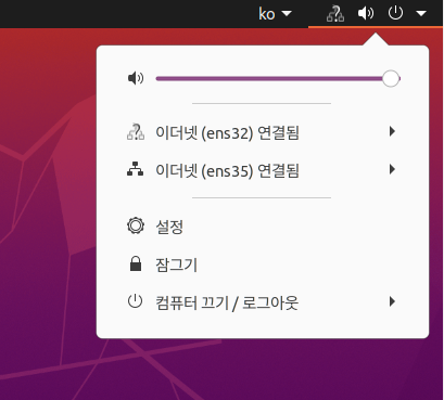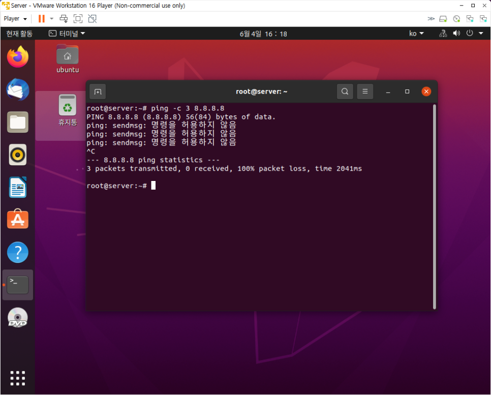 하지만 이더넷 설정에 들어가 보아도 문제를 발견할 수가 없었다. 외부로 ping을 보내보아도 네트워크가 외부로 연결이 되지 않음을 알 수 있다.
