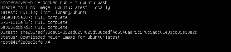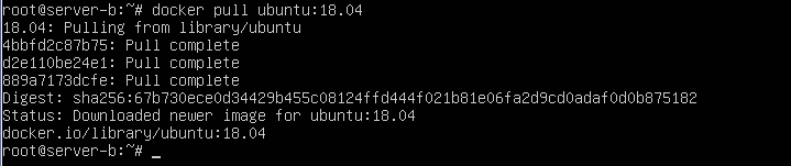 exit 명령을 입력하여 server(b) root 계정으로 되돌아온 뒤 docker pull ubuntu:18.04 명령을 입력하여 ubuntu 이미지를 다운받는다. 18.04는 버전을 의미하며, 이를 입력하지 않을 시 자동으로 최신 버전이 설치된다.