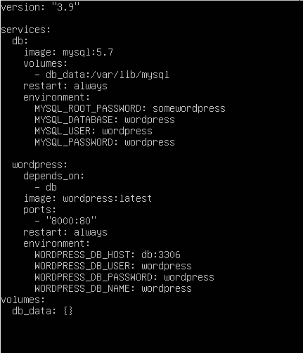 chmod +x /usr/local/bin/docker-compose 명령으로 docker-compose에 대한 권한 설정을 해준다. 마지막으로 도커 컴포즈를 통해 워드프레스를 설치하기 위해서 yml파일을 생성해야 한다. 아래와 같이 docker-compose.yml 파일을 생성해준다.