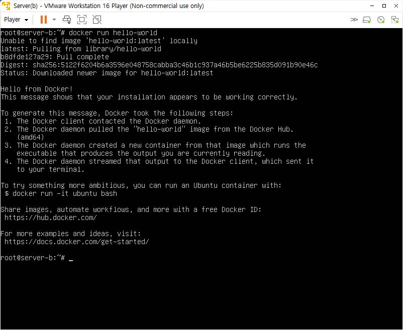 위 과정을 수행하고 나면 docker가 잘 설치되어 있을 것이다. docker run hello-world 명령을 입력하여 docker를 실행시켜보자.