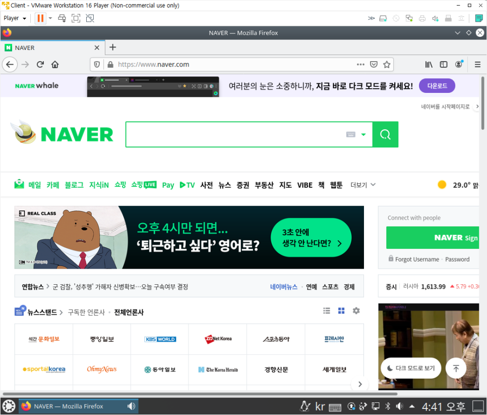 설정이 끝난 후 iptables-save > /etc/iptables.rules 명령어로 설정 내용을 적용시켜주고 Client로 들어가면 인터넷을 이용할 수 있는 것을 확인할 수 있다.