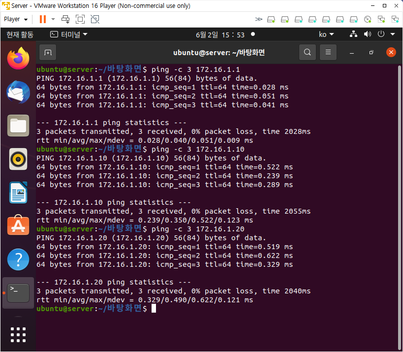 아래 사진들은 각각 server, server(b), 호스트 컴퓨터의 명령 프롬프트창에서 ping테스트를 한 것이다. 호스트 컴퓨터의 명령 프롬프트창에서 수행한 ping테스트는 외부 컴퓨터에서 방금 생성한 사설 네트워크 접속로 접속이 가능한지를 검사하기 위함이다. 마지막 사진을 확인해보면 server의 ens32(외부 네트워크와 통신이 가능한 IP)로는 통신이 되지만 사설 네트워크의 IP인 ens35와는 통신이 되지 않음을 확인할 수 있다.