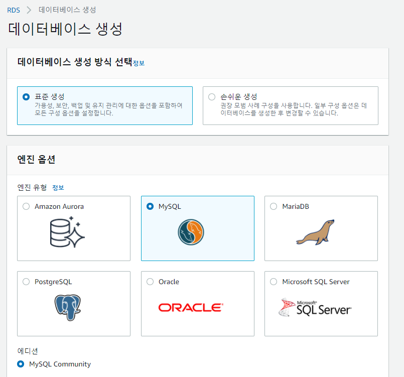 1. AWS에 로그인하여 RDS > 데이터베이스 생성 으로 들어갑니다.