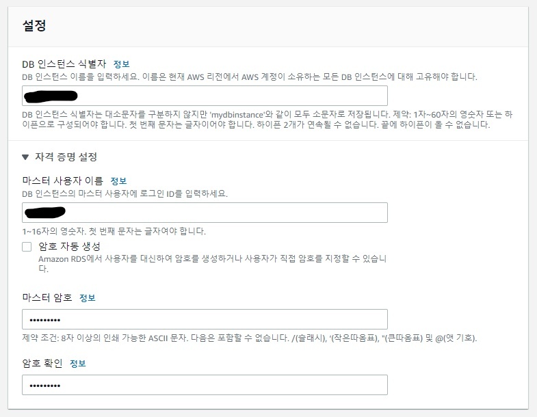 4. 설정 정보를 입력합니다. 마스터 사용자 이름과 암호는 나중에 외부에서 접근할 때 필요하므로 잊지 말아야 합니다.