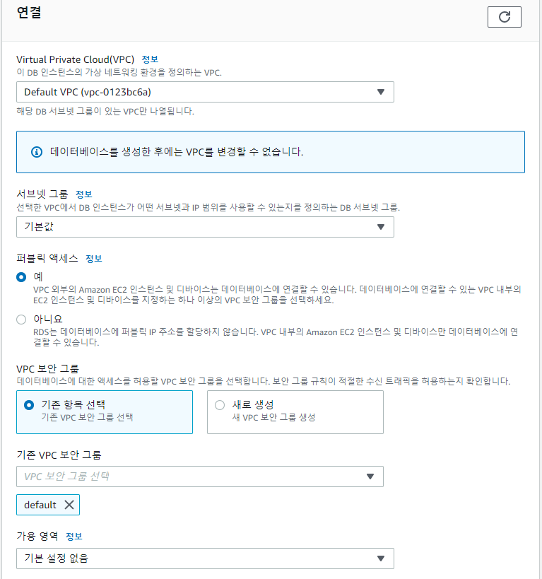 6. VPC 와 VPC 보안 그룹 설정의 경우 EC2에 연결할 목적이라면 EC2와 연계된 새로운 보안 그룹을 생성하여 연결해야 하지만 일단은 그대로 두어도 됩니다. 어차피 나중에 수정이 가능합니다. (VPC의 경우 변경 조건이 조금 까다롭기 때문에 EC2에 연결할 목적이라면 아예 새로운 VPC 생성 후에 RDS를 생성하는 걸 추천드려요~)