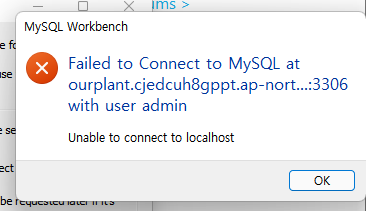 내 컴퓨터의 MySQL workbench와 AWS에 생성한 RDS 인스턴스를 연결하려는데 계속 connection error가 났습니다