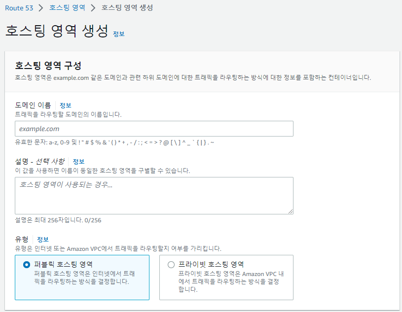 나는 우선 가비아에서 도메인을 구입하고 이를 AWS Route53에 등록해주었다. 우선, AWS Route53 > 호스팅 영역 생성에서 가비아에서 구입한 도메인을 입력한다.