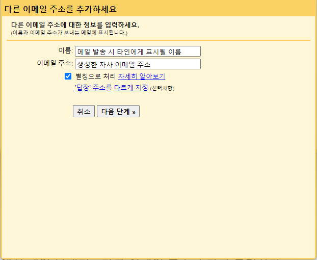 그 후, AWS SES > SMTP 설정 > SMTP 보안 인증 생성을 눌러 SMTP 인증용 계정을 생성한다. Credentials.csv 파일을 다운로드한 다음 저장한다. Gmail 설정 > 계정 및 가져오기 > 다른 주소에서 메일 보내기에서 다른 이메일 주소 추가를 누른다. 그럼 아래와 같은 화면이 나온다.