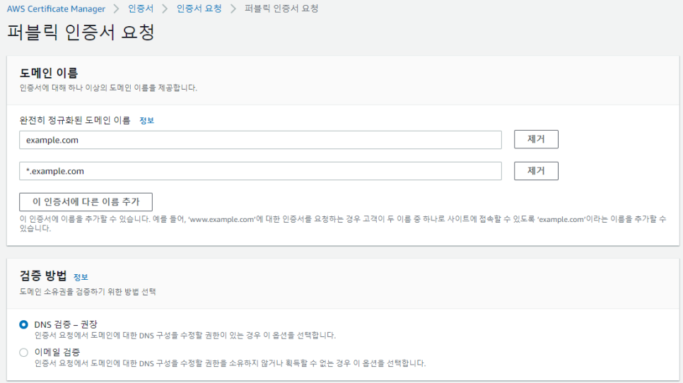 '요청'을 누르면 도메인 검증이 시작된다. 처음에는 '검증 보류' 상태였다가 '검증 완료' 상태로 넘어가게 된다.
