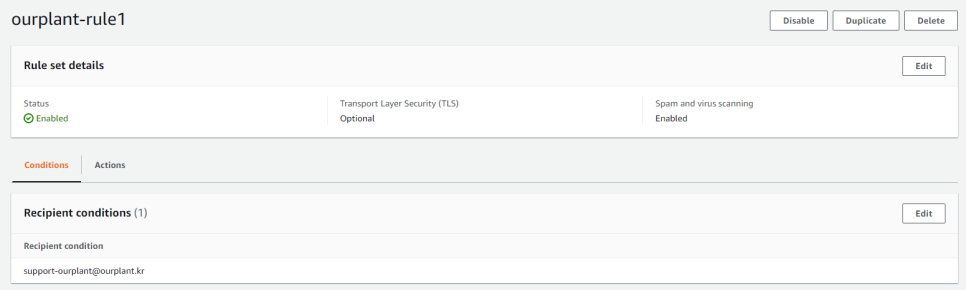 다음으로 액션 설정 페이지에서 S3 -> Lambda순으로 액션을 만들고, 이전에 만들고 설정한 버킷과 버킷 루트에 만든 폴더 이름, Lambda 함수 이름을 설정한다. 이후 만약 SES에서 lambda:InvokeFunction 권한 추가를 요청하면, 허용한다. 만약 “Could not write to bucket”이 나오면, IAM 사용자가 S3 버킷에 읽기, 쓰기 권한이 없다는 뜻이다. 그럼 람다 정책 또는 버킷 정책을 다시 확인해야 한다. 설정이 끝나면 다음과 같이 규칙이 생성된 것을 확인할 수 있다.