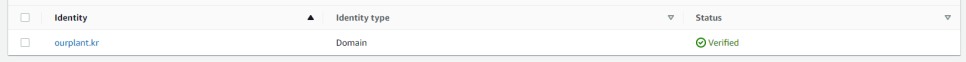 요렇게 인증해주면 아래와 같이 도메인이 인증된 것을 확인할 수 있다. (ourplant.kr은 내가 작년에 SES 설정 시에 사용했던 도메인이다)